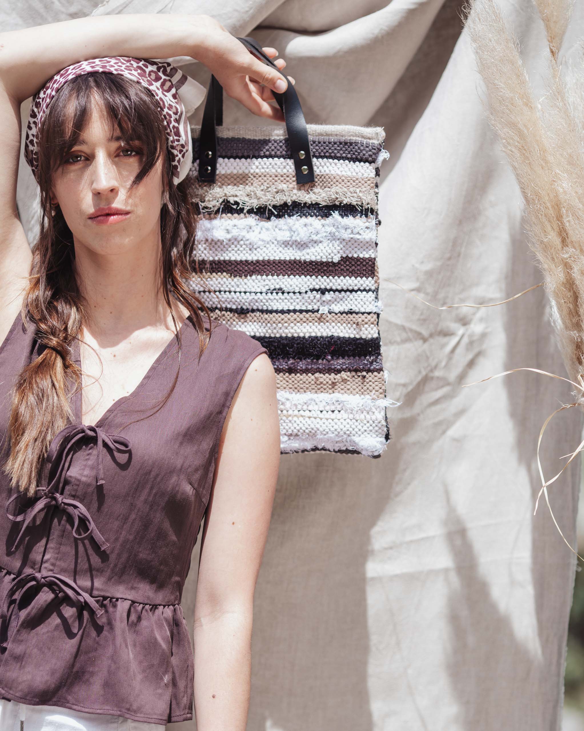 Diese mit Liebe handgefertigte Henkeltasche ist ein echtes Statement für nachhaltige Mode. In Österreich kunstvoll handgewebt, besteht jede Tasche aus recycelten Materialien und ist damit ein echtes Unikat.